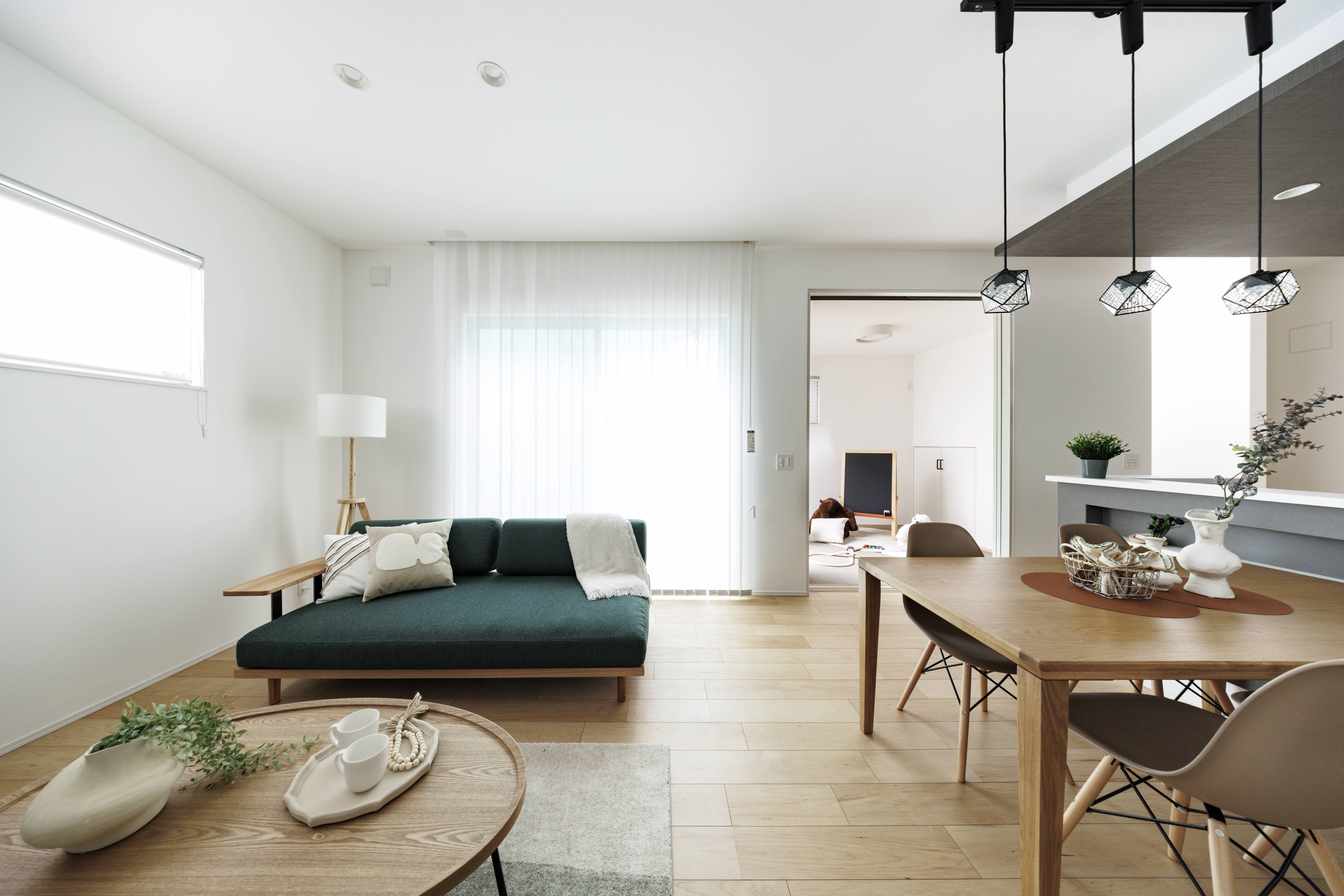 深みのあるグリーンのファブリックが、明るい室内に落ち着きを与え、空間を引き締めます。