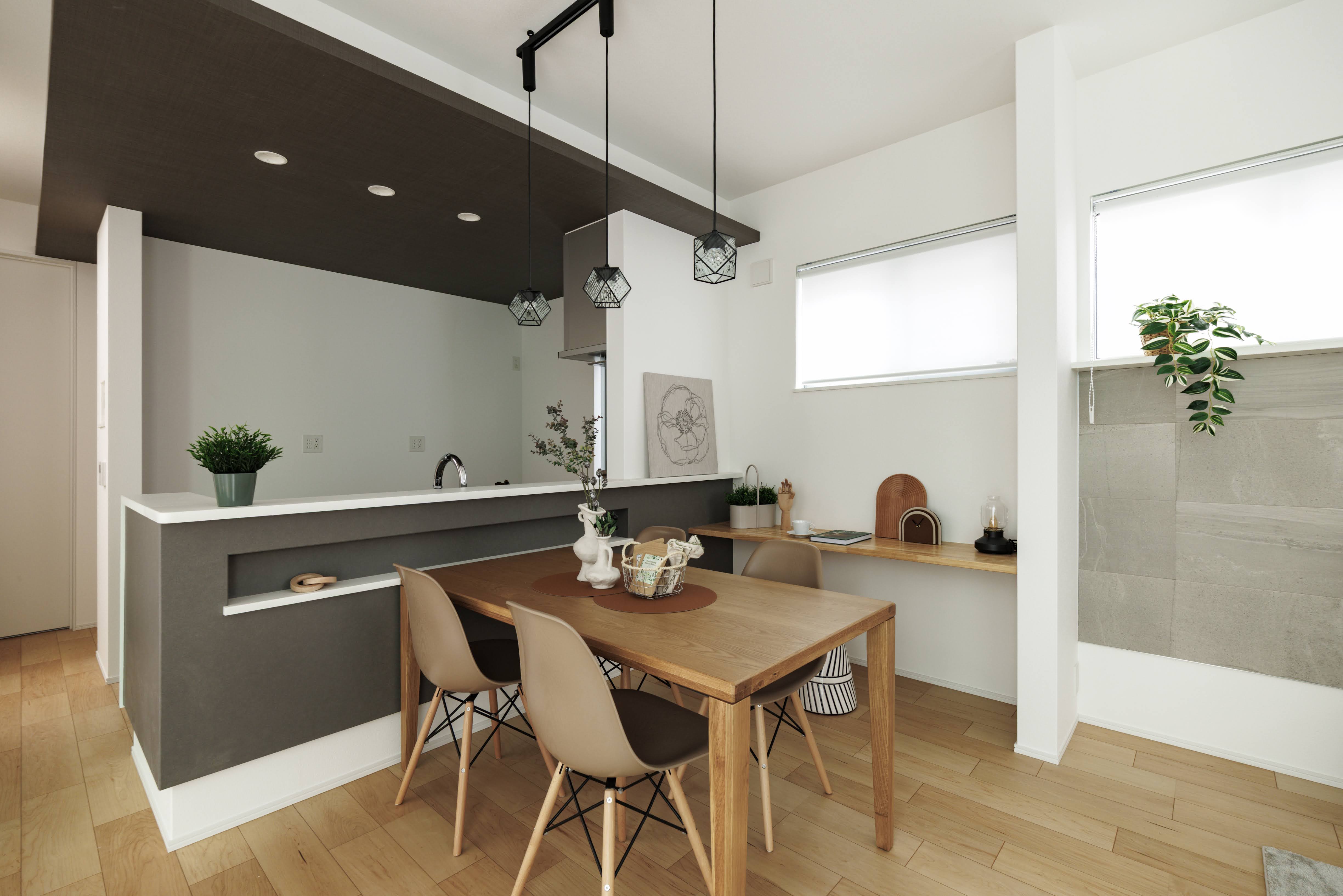 木製のテーブルと異素材チェアの組み合わせは、色味を合わせることでカジュアルになりすぎず、落ち着いた空間に。ステンドデザインのペンダントライトで空間にアクセントを。