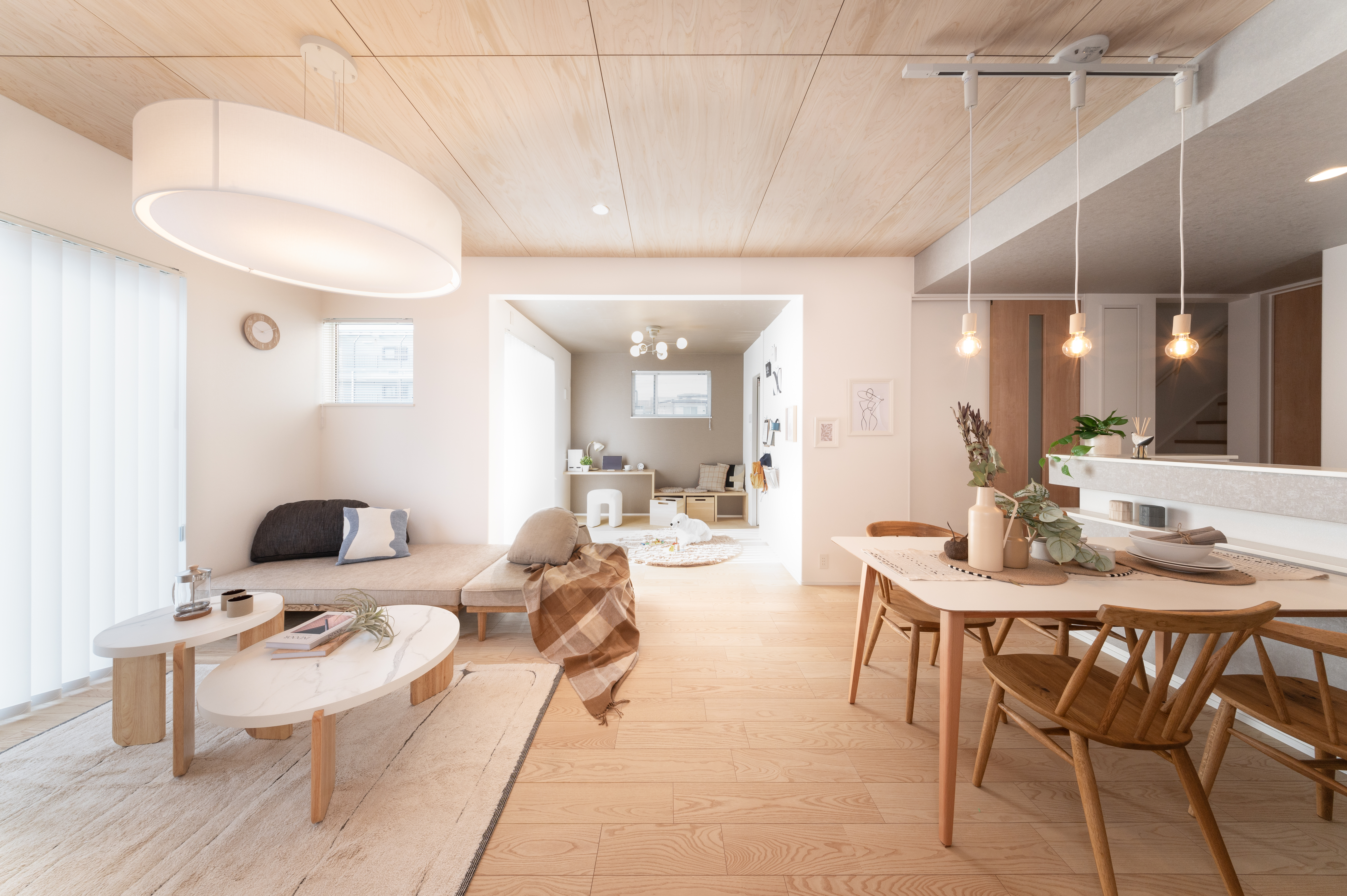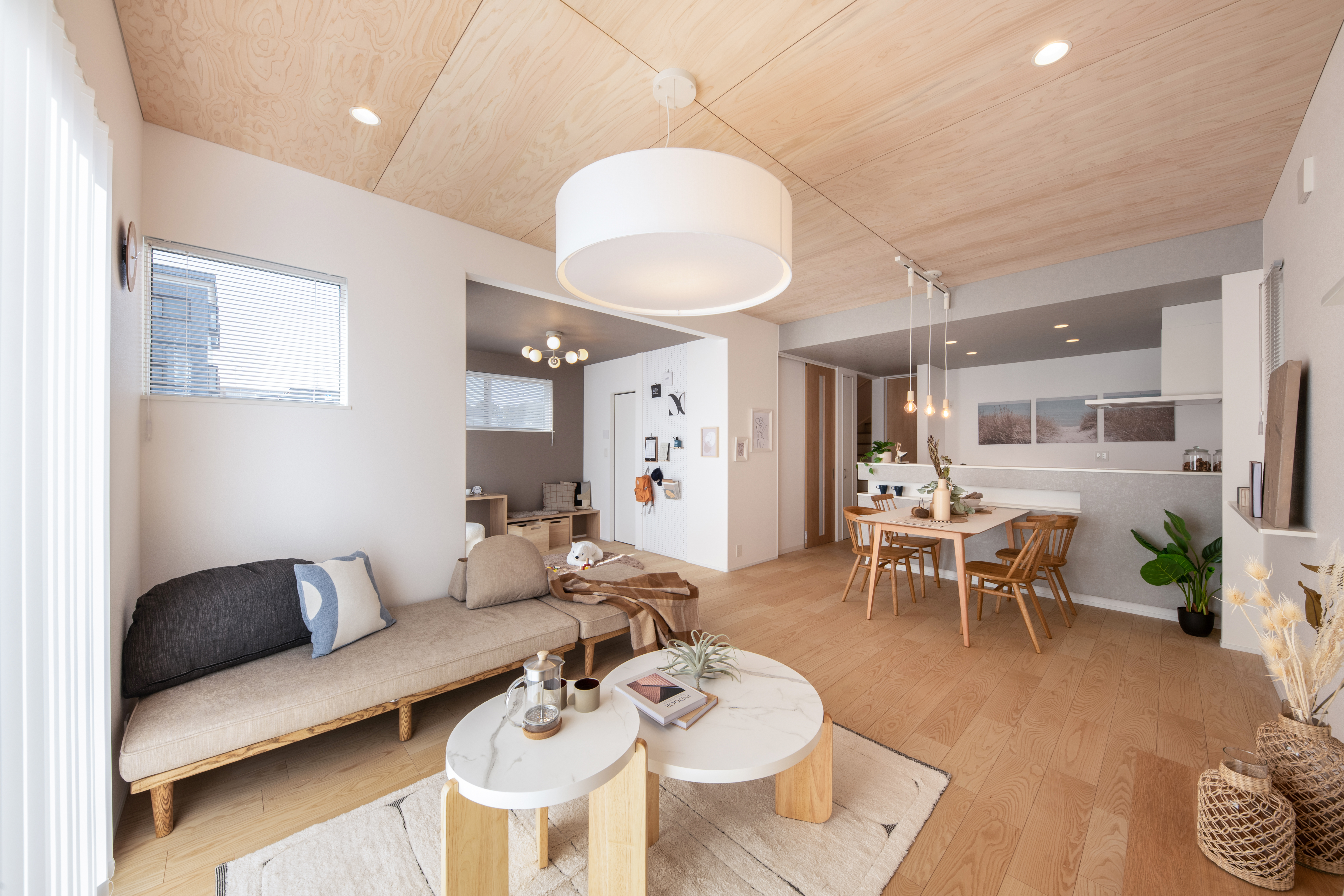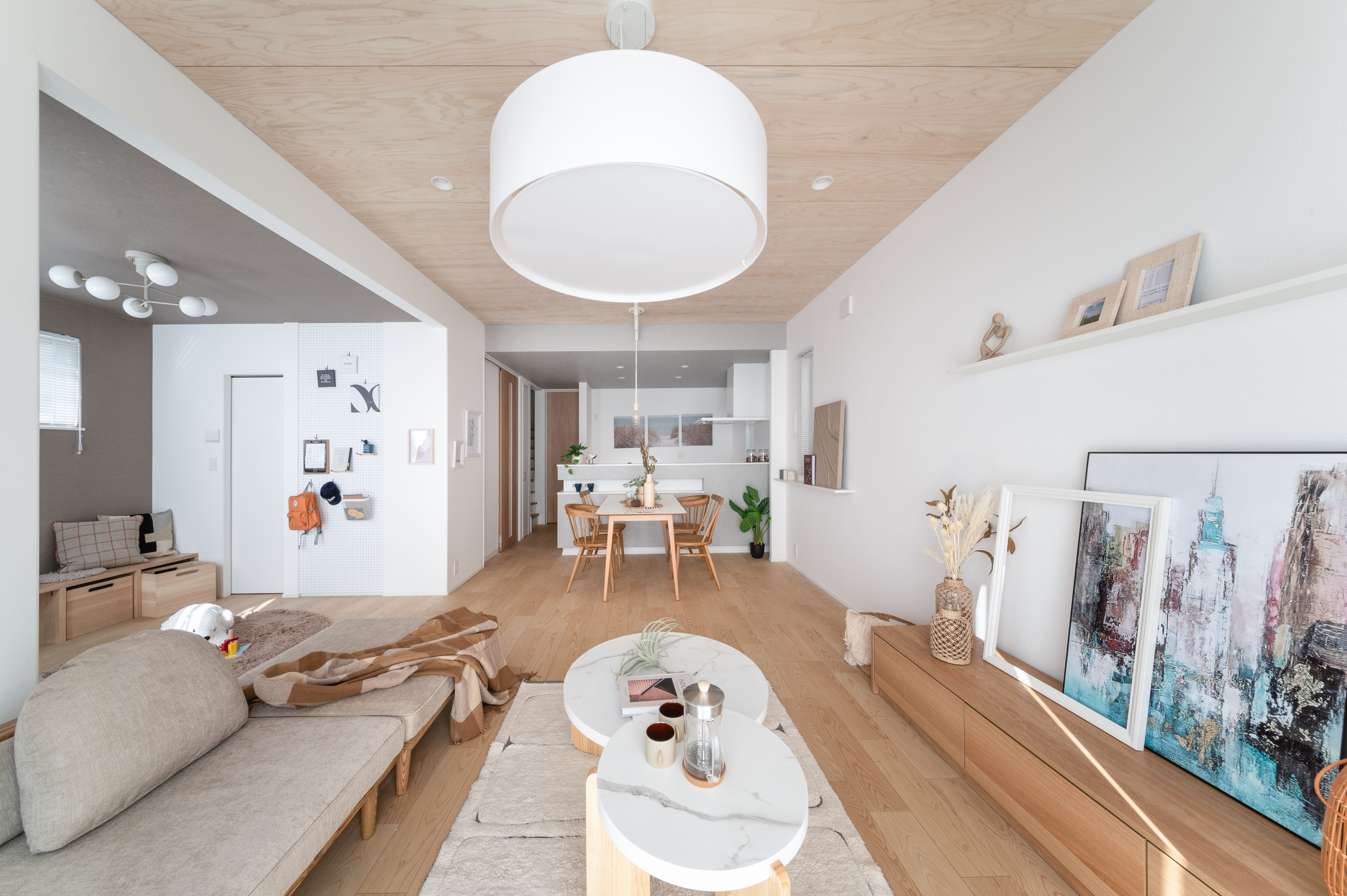 ナチュラルな内観に、「ウッド7:石・ファブリック3」の絶妙なバランスで素材を取り入れたコーディネート。異素材を使うことで都会的な印象に。丸みのあるフォルムが優しさをプラスします。