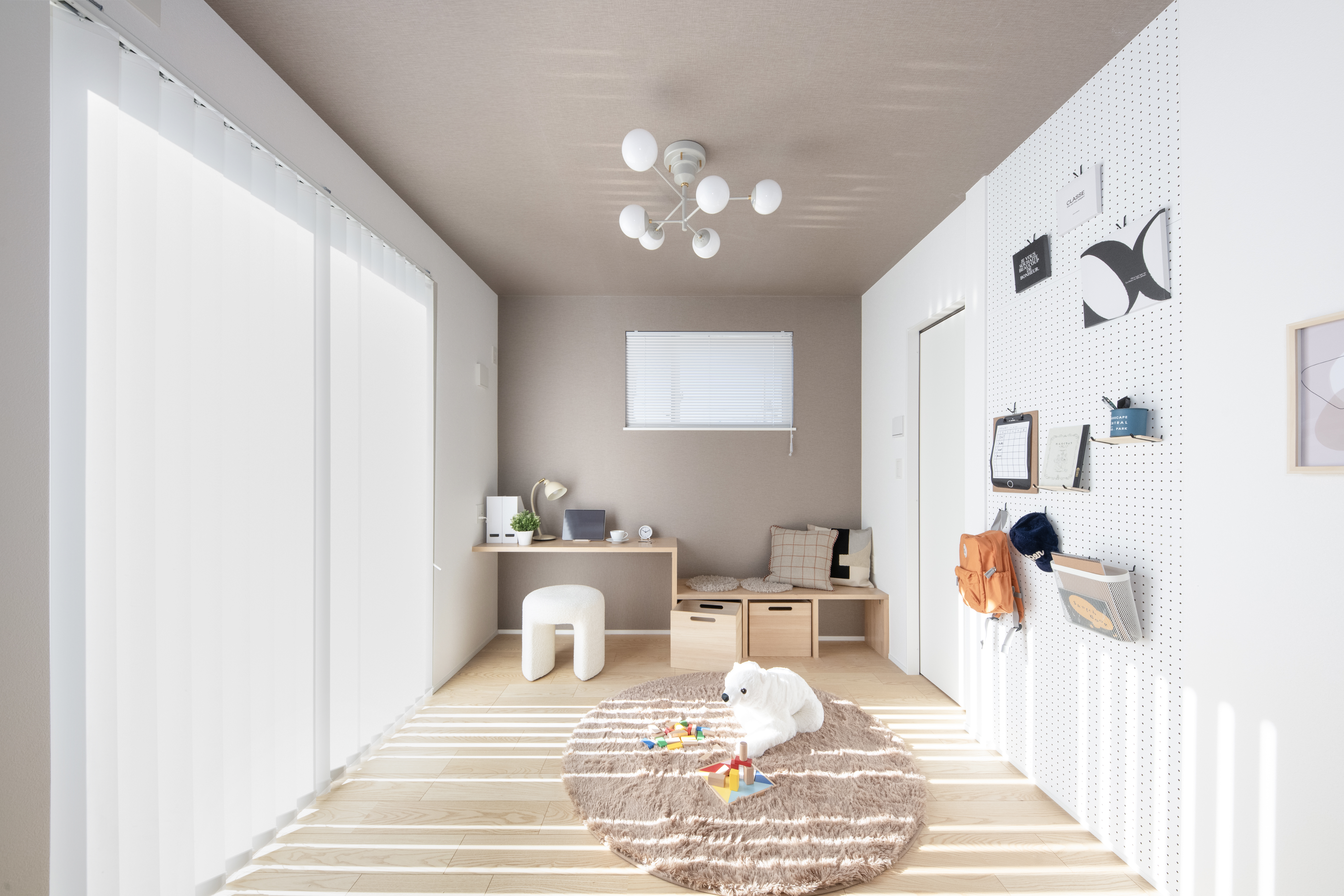 リビング隣の個室にも、球体の照明と丸みのスツールを配置して柔らかい印象で統一。有効ボードを使った壁面には、見せる収納として生活感もデザインに。