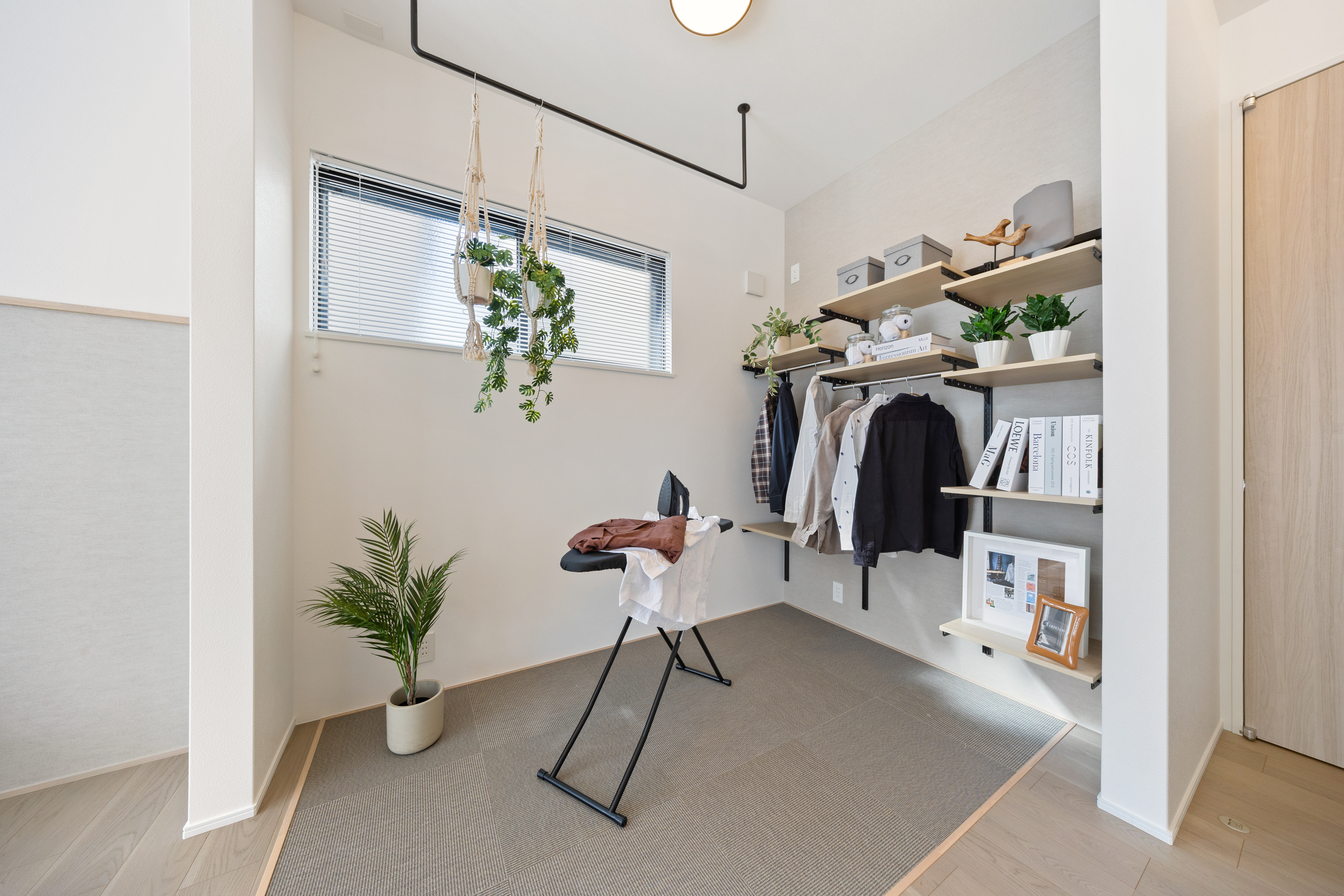 オープンクローゼットやキッチン周りにブラックのアイアン素材を効かせることで、全体を引き締め、植物の鮮やかなグリーンをより引き立たせます。