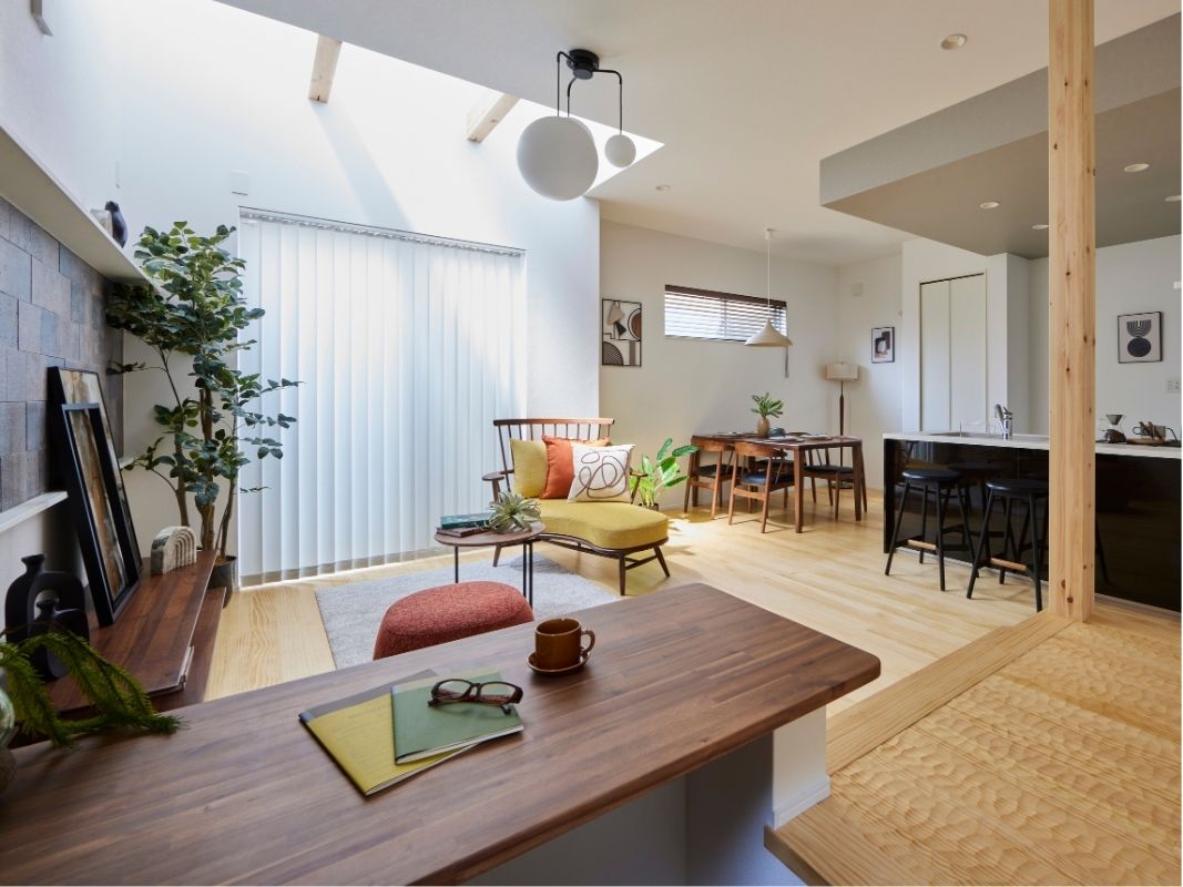 一枚板テーブルで小上がりとリビングをつなぐ和モダンスタイル