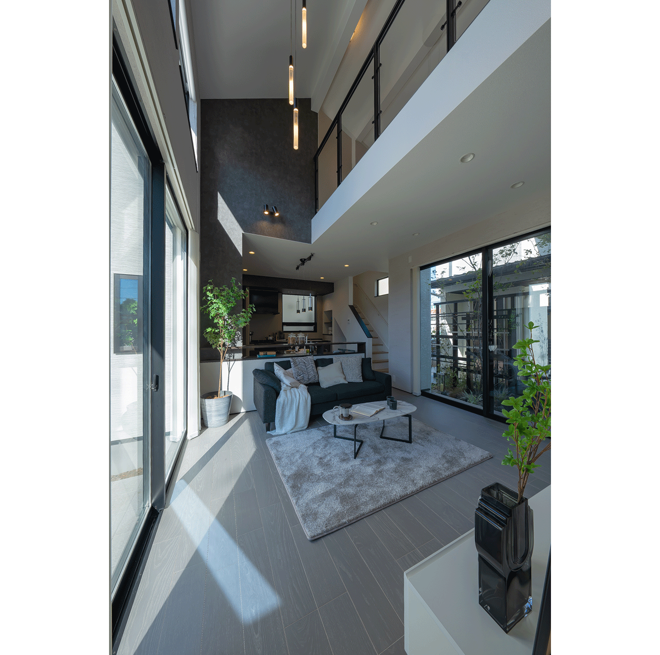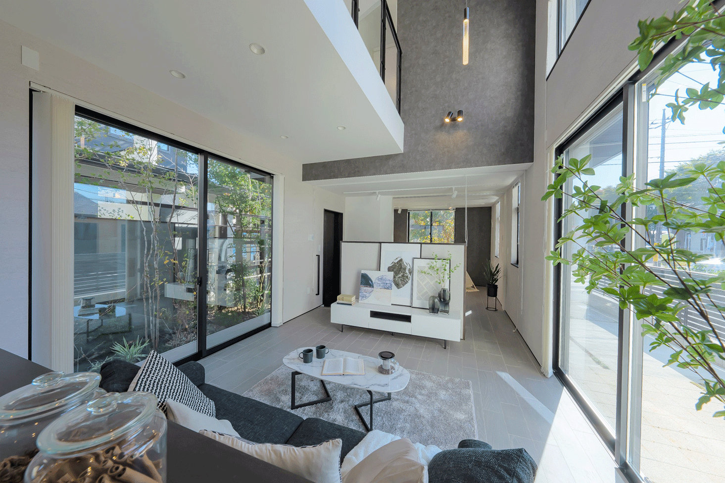 都会的な空間に、空や緑など自然を身近に感じる開放感たっぷりなリビング。