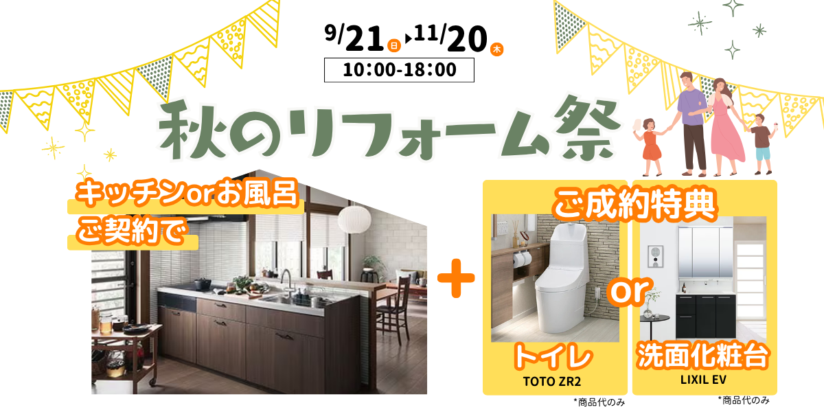 キッチン・お風呂リフォームで【ご成約特典:トイレ or 洗面化粧台】付き! 秋のリフォームキャンペーン