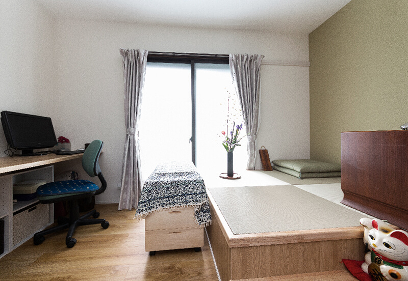 ここは和室と縁側だったんです。和室を洋室に変更し、縁側に机を作り付けるようお願いしたんですが、担当の方が「机の後ろに畳スペースを作るのはどうか」と。鏡台が置けて、下は収納になっています。
