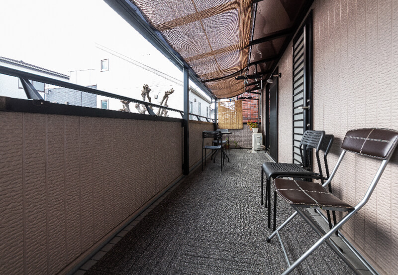 南向きのベランダに屋根を付けたので、夏も過ごしやすくなりました。ベランダには、お茶を飲めるようテーブルセットを置いています。以前あった廊下はなくして、さらに階段の上に少し床を足してリビングを広くし、キッチンを設置しました。シャワールームも作り、和室だった寝室は、洋室に変更しました。