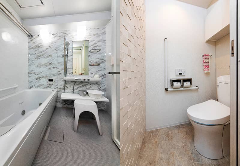 玄関は好みのタイルに張り替えてもらい、収納や鏡も納得のいくものをチョイス。浴室は広くなり、肩湯もつけたので、以前より入浴時間が長くなりました。肩こりが改善するといいのですが。