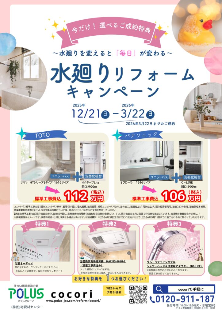 住宅資材センターでは、現在 「水廻りリフォームキャンペーン」 を開催中です。