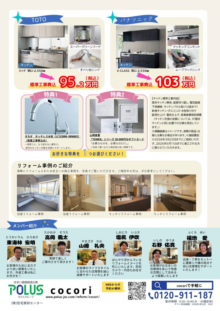 3月20日(日)までに対象のお風呂、またはキッチンのリフォームをご成約いただいたお客様限定で、毎日の生活がより豊かになる 「選べるご成約特典」 をプレゼントいたします!